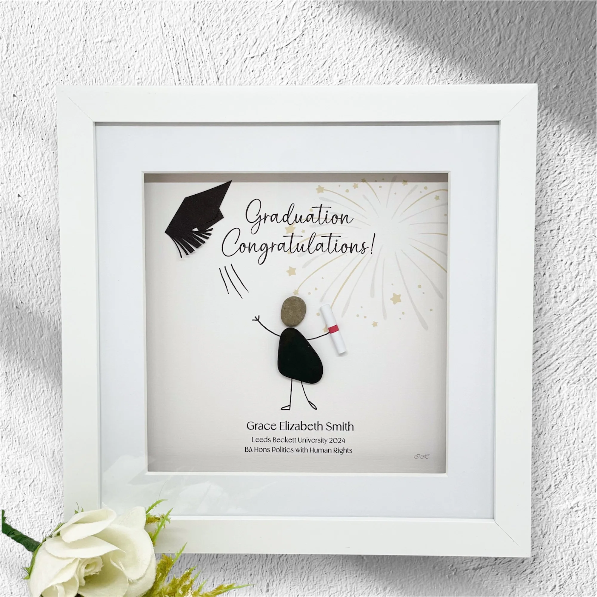 The perfect Graduation gift! The picture’s quote reads: ‘It’s your time to fly...Graduation 2025’. The picture has a cute pebble person in their Graduation cap and is holding their Degree certificate. It’s finished off nicely with two glittered stars and a mount. If you like a plainer design you can opt to omit the stars.